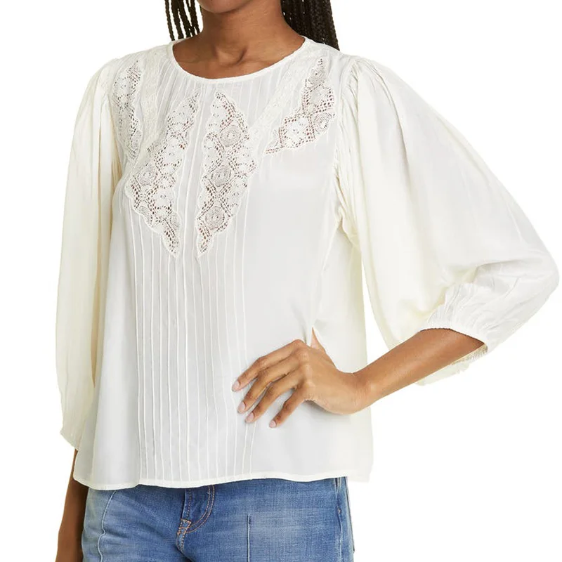 Fall Tops Lady Scoop Neck Tiny Pin-tucks Long Sleeves Lace Inset Casual Blouse Women’s Shirts