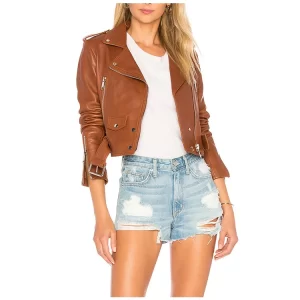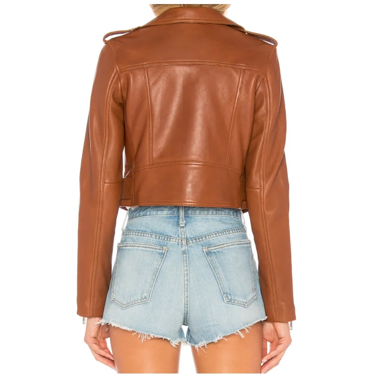 High Quality Real Leather Belted Waist Zipper Closure Solid Pockets Spring Cropped Biker Jacket Women