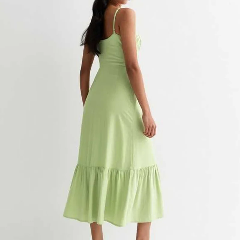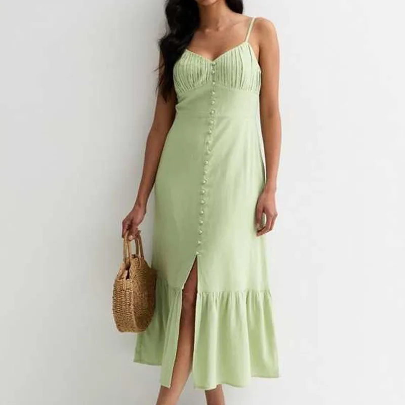 2024 Modest V-Neck Adjustable Strap Decorative-Button Tired Hem Midi Women Casual Summer Midi Cotton Dresses