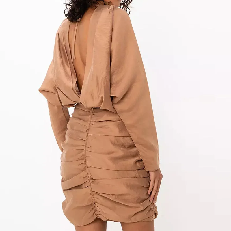 Autumn Style Open Back Sexy Mini Dress with Solid Twist Front Ruched Textured Slim Women’s Party Dresses