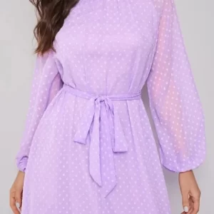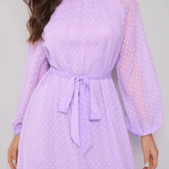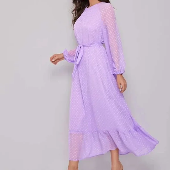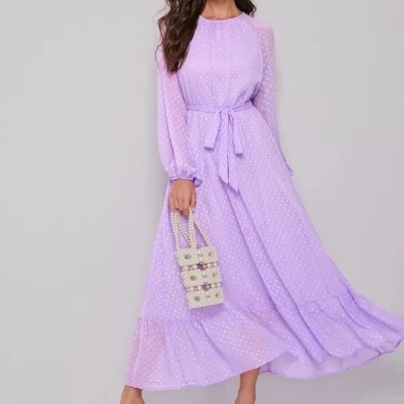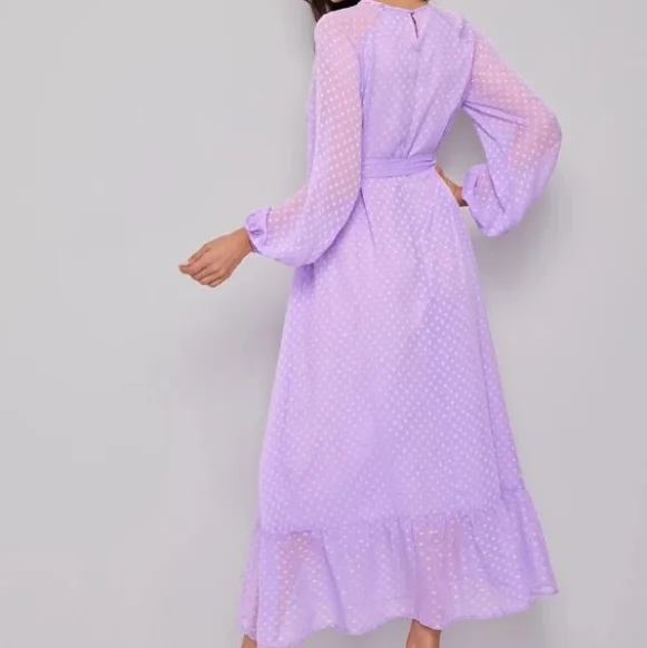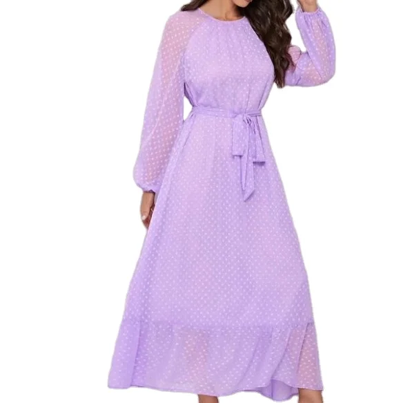 Autumn Women’s Raglan Lantern Sleeve Flounce Hem Swiss Dot Dress O-Neck Elegant Woven Maxi Dress