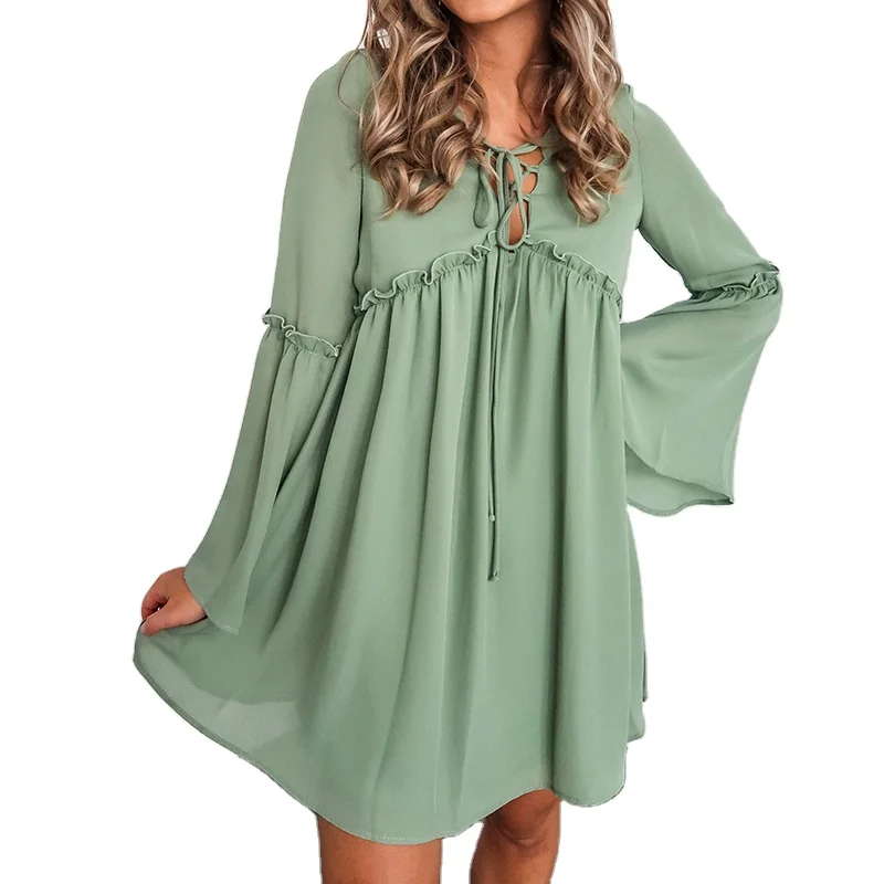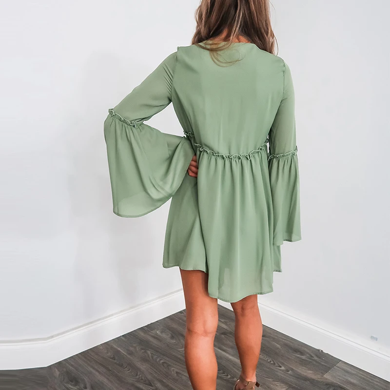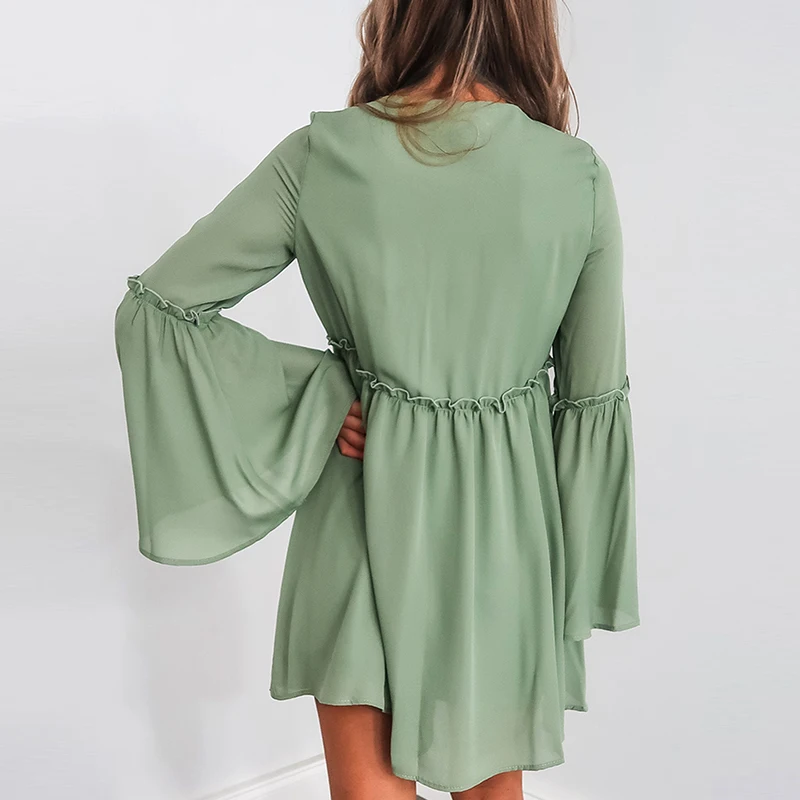 Best Selling Casual Wear Women V Tie Neck Batwing Sleeve Frill Trim Casual Solid Mini Dresses