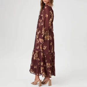 Boho Floral Print Maxi Dress-Vintage Long Sleeve V-Neck Casual Gown