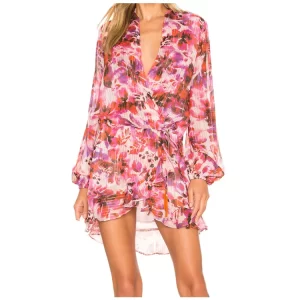 Boho Style Chiffon Vintage Floral Print Long Sleeve Wrap Dress Belted Ruffles Printed Dress