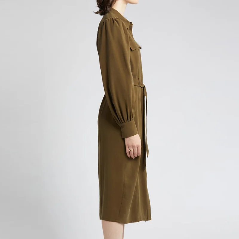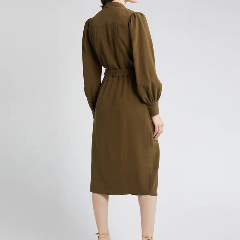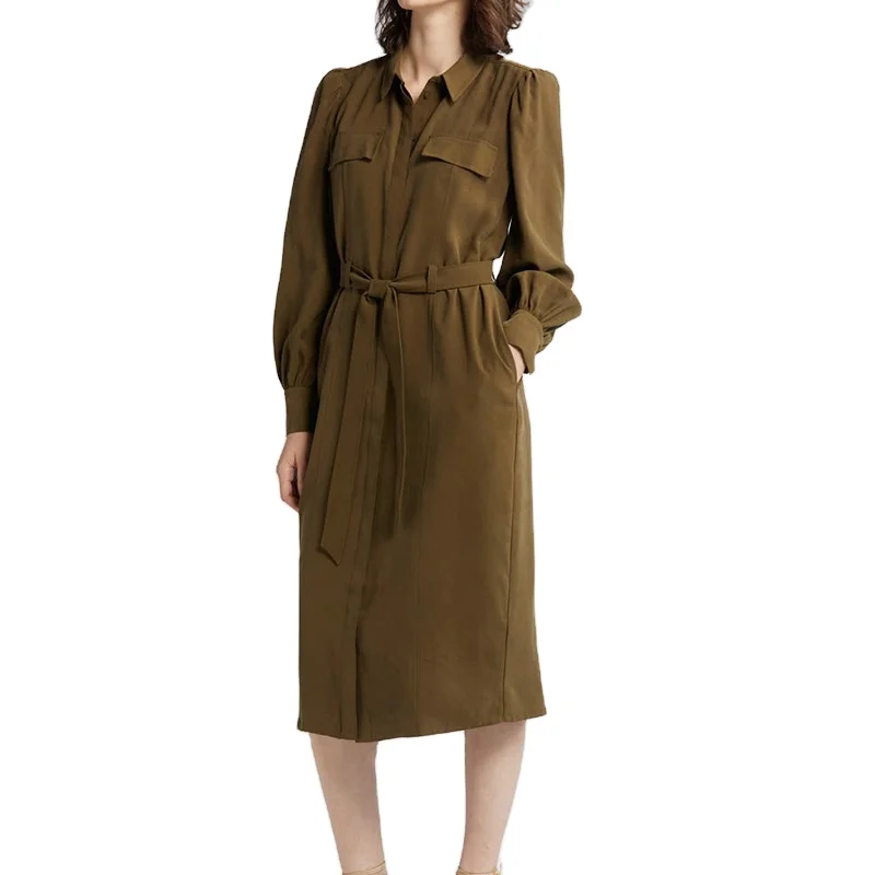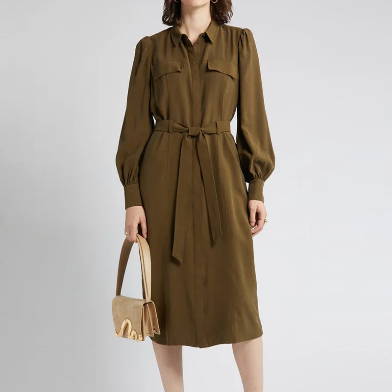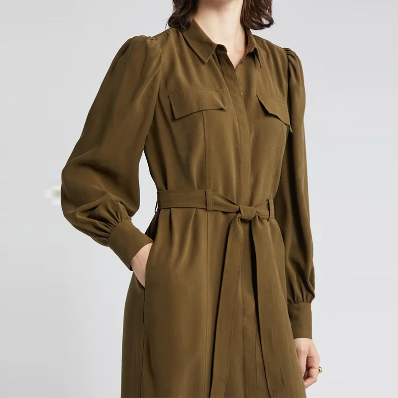 Fall Clothes Office Wear Lady Elegant Dress Spread Collar Tie Waist With Pockets Utility Shirt Formal Career Women Midi Dress