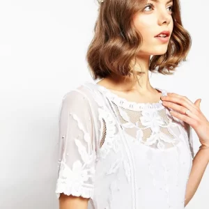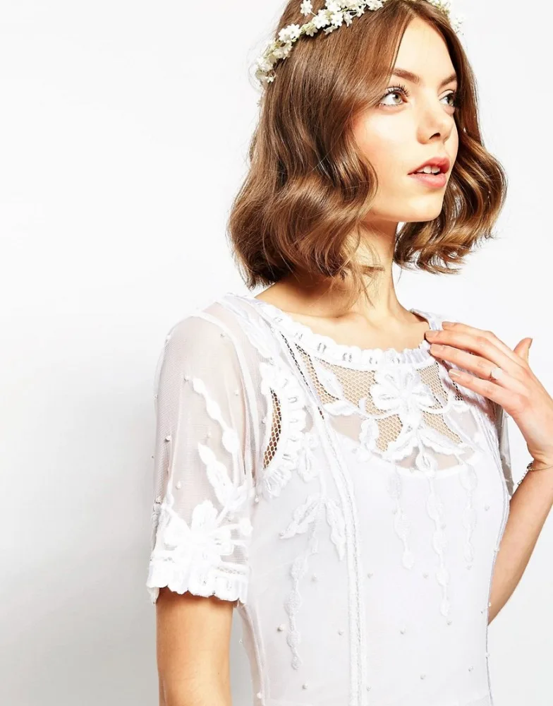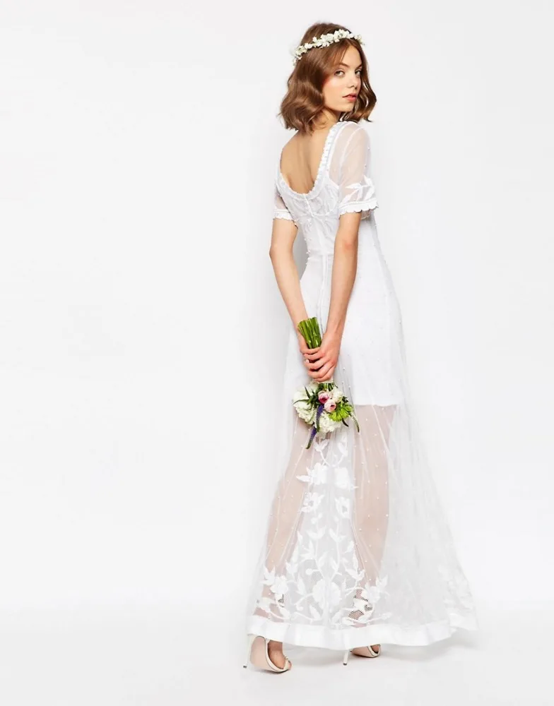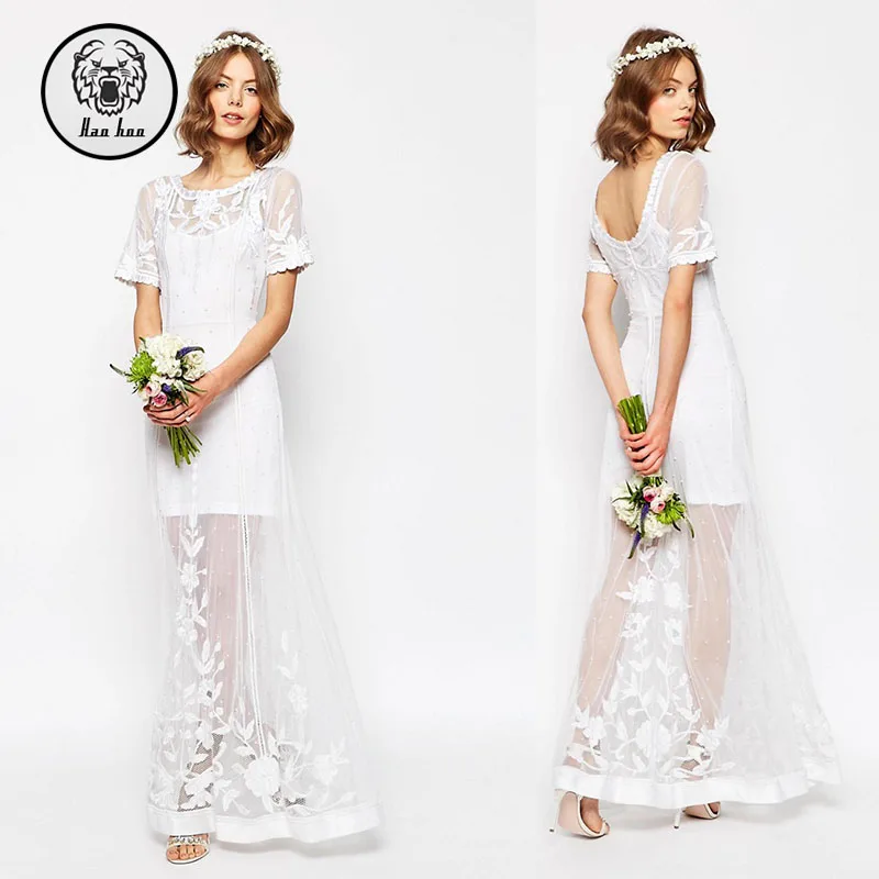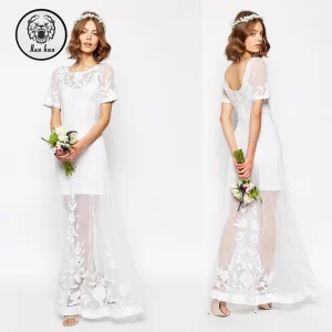 Ladies Wedding Dress Short Sleeve Lace Bridal Delicate Floral Lace And Pearl Slim Maxi Dress
