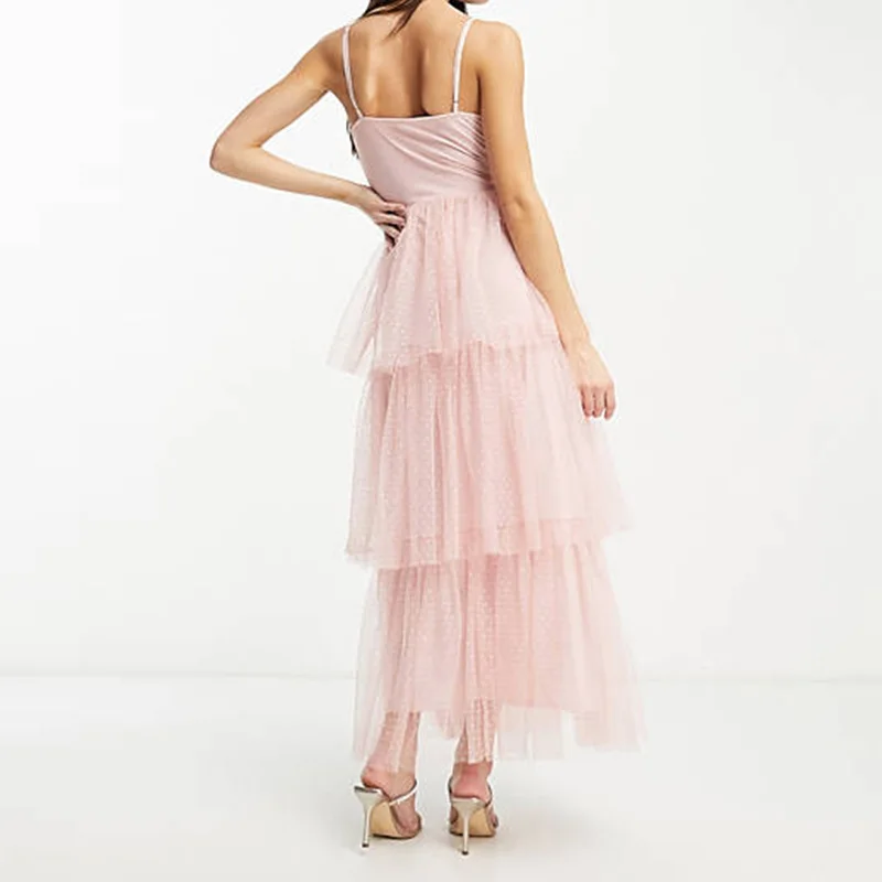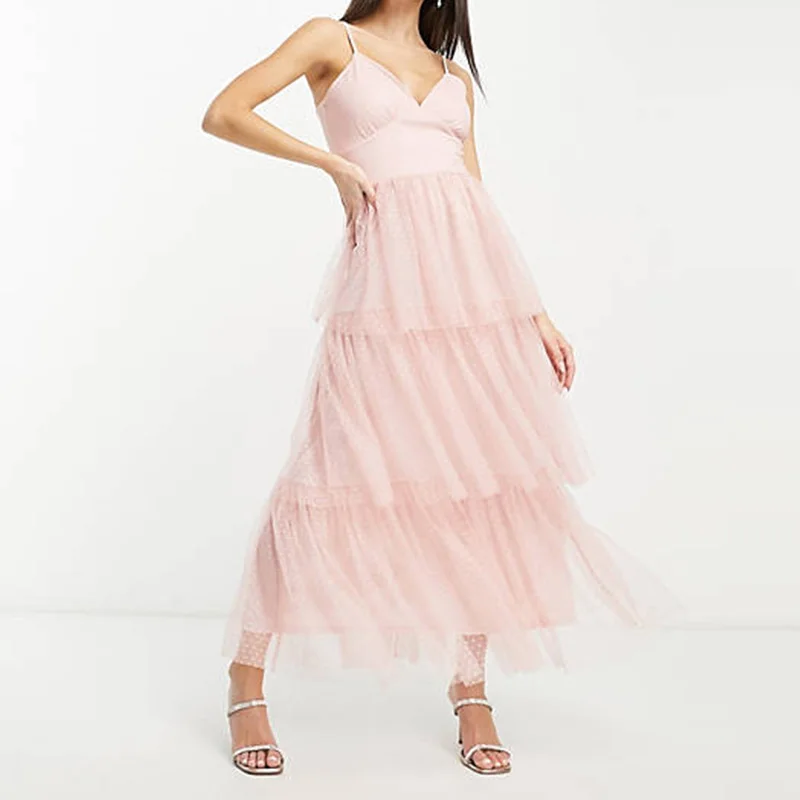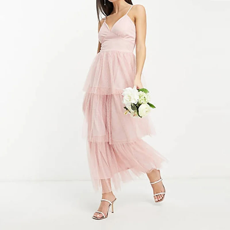 Weeding Dress Bridesmaid V-neck Pink Tulle Spot Textured Tiered Elegant Midi Cami Dress