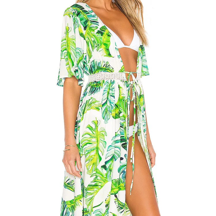 Hot sell 100% rayon Palms printed Crochet trim sexy long sleep robe women
